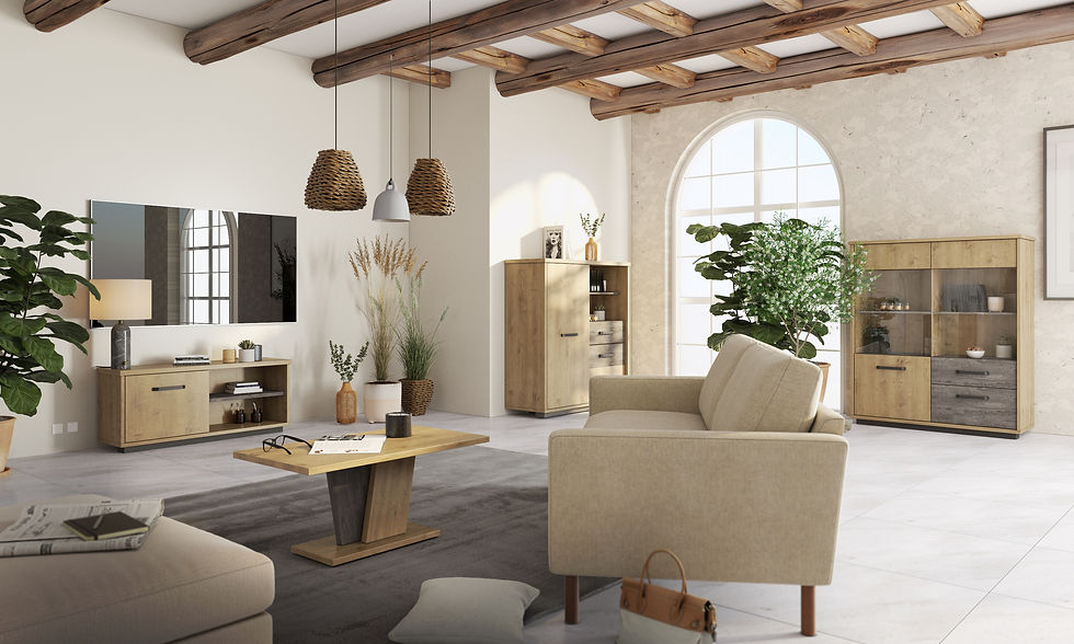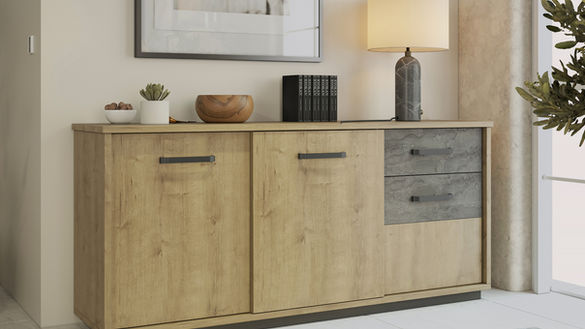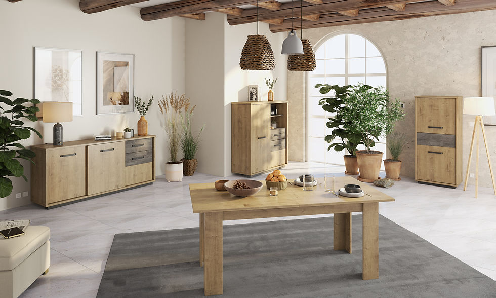 minérales et lignes contemporaines. Cette collection se distingue par son caractère authentique : des façades en bois aux nuances dorées, des touches minérales qui évoquent la pierre, et des formes robustes qui apportent une présence élégante à chaque pièce. Qu’il s’agisse du buffet, du vaisselier ou de la table, chaque meuble offre un équilibre parfait entre style naturel et fonctionnalité moderne. TERRA a été conçue pour s’intégrer facilement dans tous les intérieurs : maisons de charme, espaces modernes ou ambiances bohèmes. Elle apporte immédiatement une sensation de bien-être grâce à ses matériaux chaleureux, ses volumes généreux et sa simplicité raffinée. Adoptez la collection TERRA : une invitation à vivre dans un décor où la nature, la